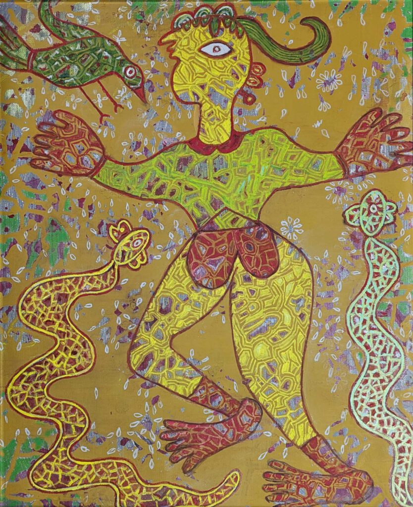 画面中央で両手を広げ、軽やかにステップを踏むような生命体。その周囲を、知恵と再生の象徴とされる「虹の蛇」を思わせる生き物や、物語を運ぶ鳥たちが取り囲んでいます。背景に散りばめられた繊細なドット(点描)や幾何学模様は、目に見える形を超えて万物が繋がり合っている「いのちの連なり」を視覚化したものです。