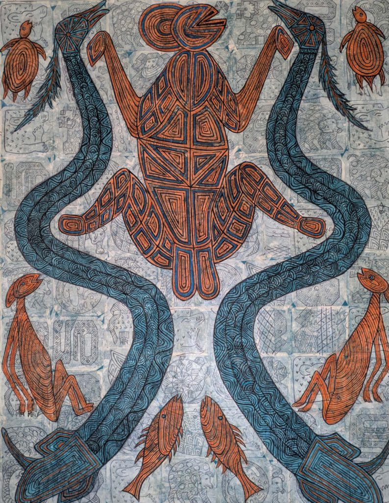 本作の根幹を成すのは、水墨とアクリルが織りなす圧倒的な奥行きです。 キャンバスの最下層には、水墨によって古代から伝わるモチーフや小動物が無数に描き込まれ、人類が共有する「古の記憶」の地層を形成しています。その静謐な地層の上から、知恵の象徴である二頭の大きな蛇、そして中央に鎮座する象徴的な生命体が、緻密な幾何学模様を纏ってアクリル絵具で大胆に重ねられています。